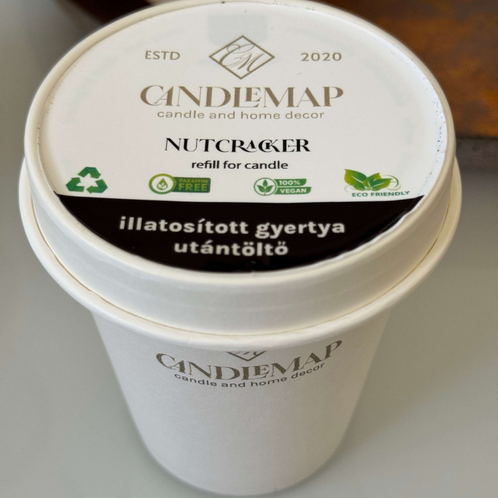 Távolítsd el a papírpoharat a viaszról, és helyezd be a gyertyaüvegbe – akár a CandleMap eredeti üvegébe, akár bármilyen kb. 300 ml-es hőálló pohárba.