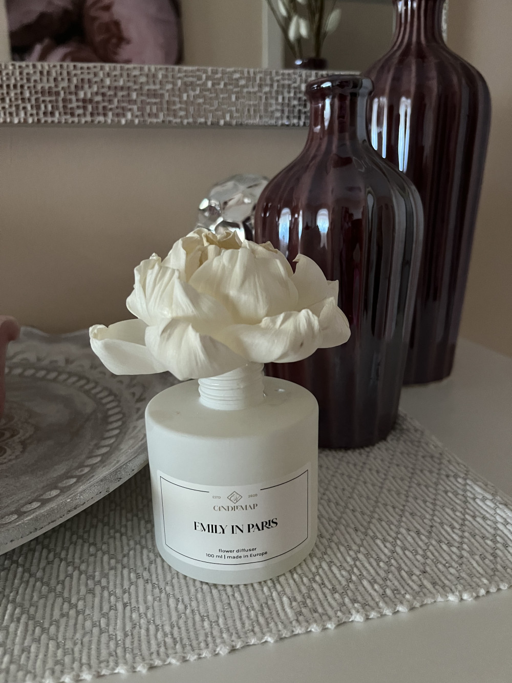 Minden diffúzorunkhoz egyedi, kézzel formázott virágot adunk, amelyet tápióka növény finom szárából készítünk.