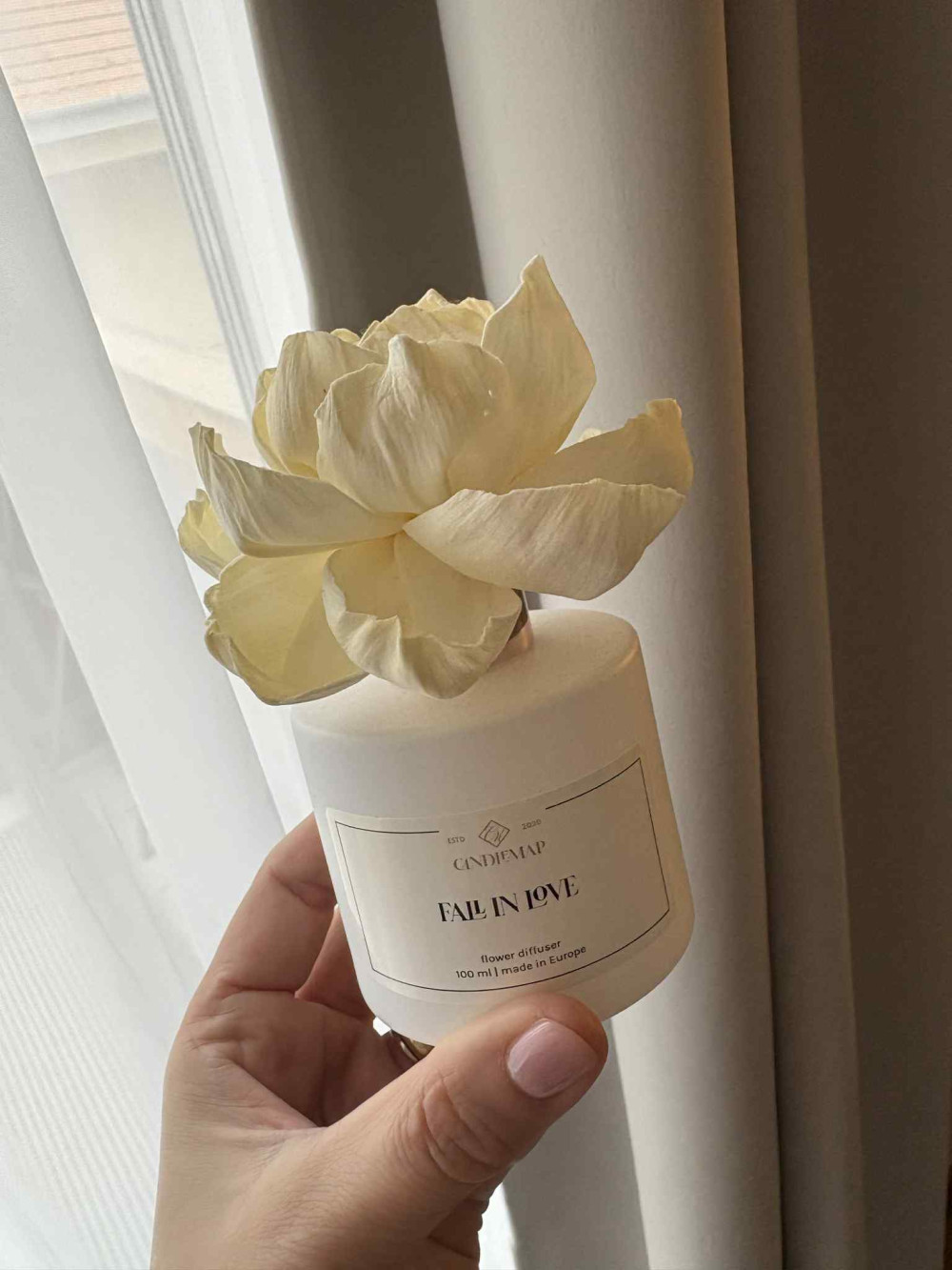 Minden diffúzorunkhoz egyedi, kézzel formázott virágot adunk, amelyet tápióka növény finom szárából készítünk.