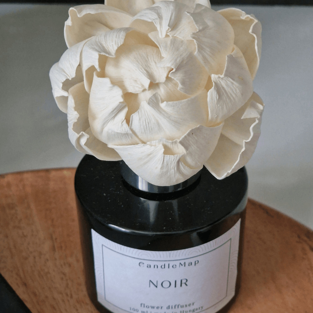 Minden diffúzorunkhoz egyedi, kézzel formázott virágot adunk, amelyet tápióka növény finom szárából készítünk.